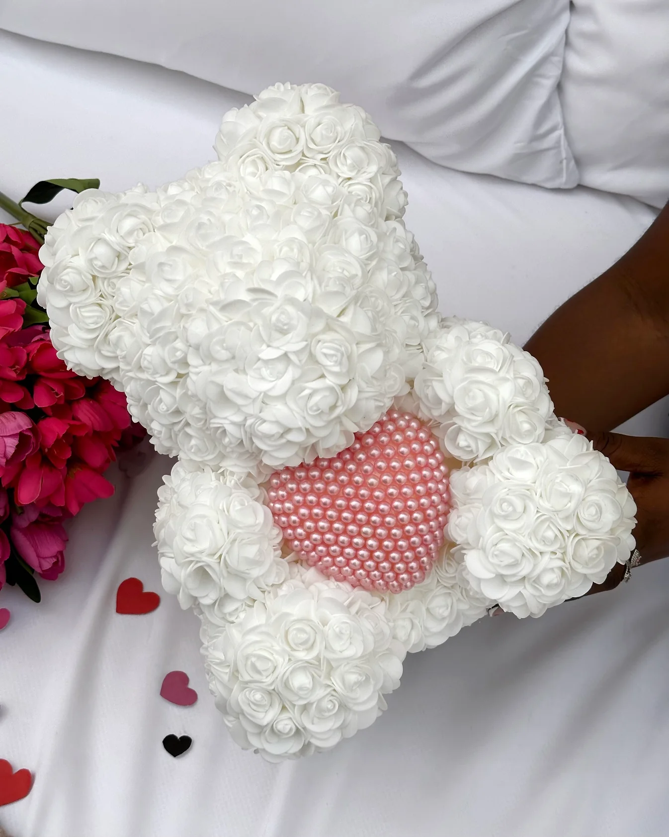 Our signature Rose Teddy Bear, delicately crafted with roses and a pearl heart.